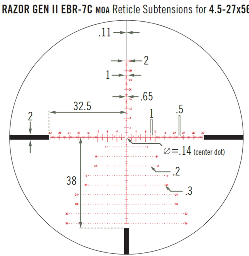 Прицельная сетка EBR-7C расположена в первой фокальной плоскости, имеет разметку в угловых минутах (МОА). Конфигурация практически полностью соответствует популярному снайперскому варианту «Хорус». Расширенная штрих-маркировка в нижних квадрантах позволяет вести огонь выносом. По элементам сетки удобно компенсировать падение траектории полета пули, брать правки на ветер, а также упреждение на движение цели. Кроме того, опытные стрелки могут вычислить расстояние к объекту, зная его габарит, и определить скорость движения цели. Особенностью и главным преимуществом FFP сеток является постоянство угловых размеров. Сетка пропорционально увеличивается с изменением кратности.