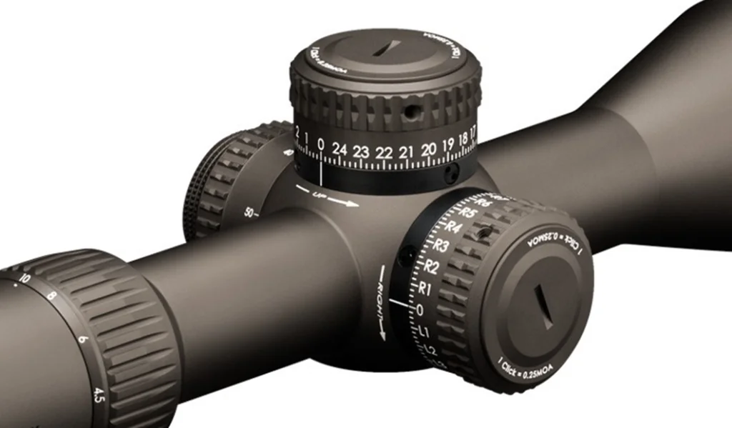 Для введения поправок на дальность и ветер предусмотрены массивные револьверные головки тактического типа с хорошо заметной разметкой и ощутимыми на слух щелчками. Конструкция защищена от загрязнений и попадания пыли, песка и грязи. Система L-Tec™ с выдвижным штифтом обеспечивает визуальный контроль количества оборотов, а стопорное кольцо Rev Stop Zero быстрый возврат настроек. Цена клика 1/10 mrad, запас хода по вертикали 33 mrad, горизонтали 14 mrad. За полный оборот барабана сетка сместиться на 10 mrad.