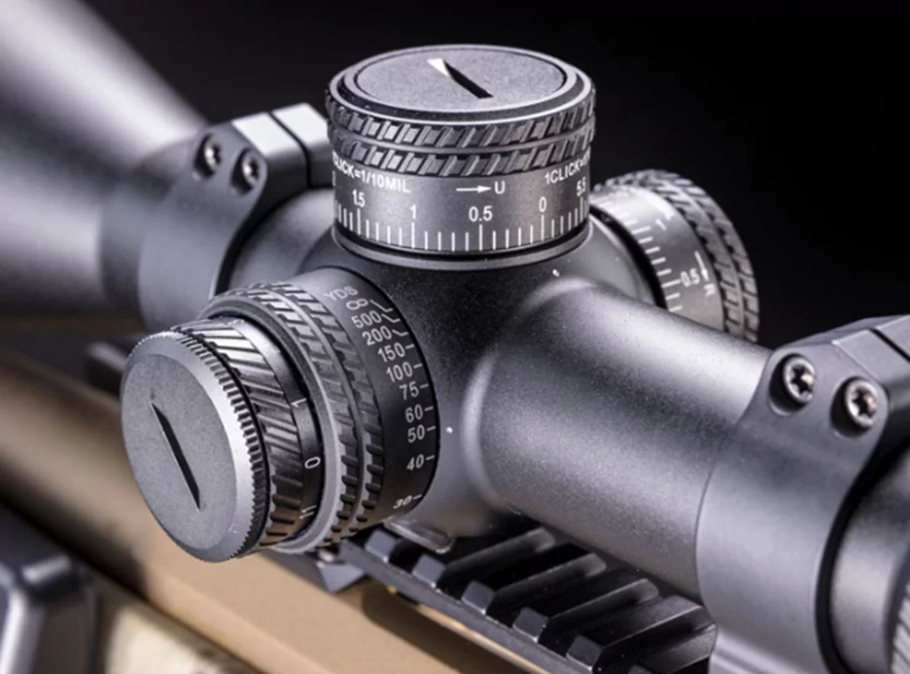 Отстроить положение СТП в зависимости от дистанции можно при помощи турелей тактического типа. Для ввода правок следует слегка приподнять револьверную головку, а после опустить. Цена клика 1/10 Mil, запас хода по вертикали и горизонту 18 Mil. Предусмотрены функции блокировки и установки нового ноля. Свести к минимуму количество промахов при стрельбе на дальних дистанциях поможет ручная отстройка от параллакса боковым барабаном.