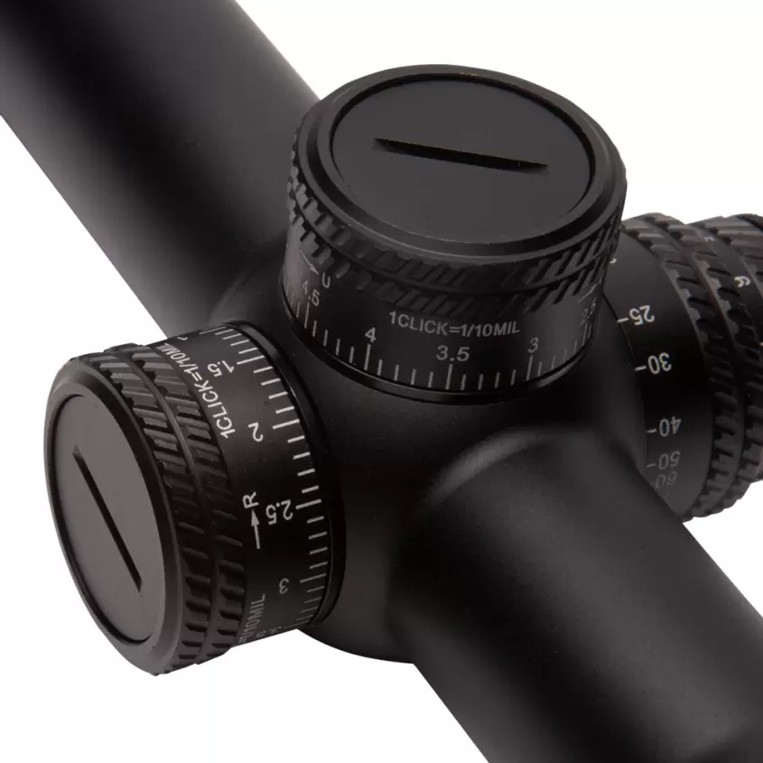 Отстроить положение СТП в зависимости от дистанции можно при помощи турелей тактического типа. Для ввода правок следует слегка приподнять револьверную головку, а после опустить. Цена клика 1/10 Mil, запас хода по вертикали и горизонту 18 Mil. Предусмотрены функции блокировки и установки нового ноля. Свести к минимуму количество промахов при стрельбе на дальних дистанциях поможет ручная отстройка от параллакса боковым барабаном.