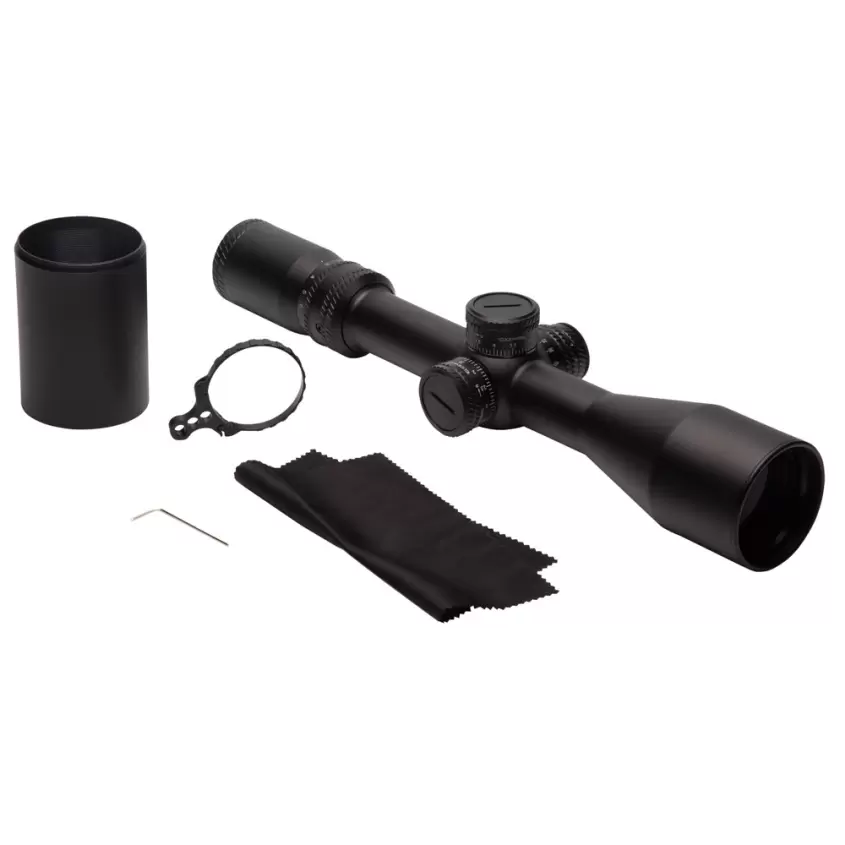 Световой диаметр объектива в 50 мм предоставляет предельно четкое и контрастное изображение даже на максимальном увеличении. Повысить светопропускную способность также помогло многослойное покрытие линз Fully multi-coated с антибликовым эффектом. Диапазона увеличения от 3 до 18 крат вполне достаточно для комфортной стрельбы по мелким и крупным объектам на дистанциях до и более 500 метров. В комплекте поставки имеется специальное кольцо с упором для пальца для быстрой смены уровня увеличения. Поле зрения при кратности 3х равно 11 м, на максимуме 1,9м. Окулярная точка удалена на 118 мм, что является безопасным при стрельбе крупным калибром. Для идеальной настройки картинки доступна регулировка диоптрий (± 2 дптр).