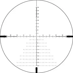 Прицел VortexDiamondbackTacticalFFP 4-16x44 оснащен тактической сеткой EBR-2C (аналог Хорус), расположенной в первой фокальной плоскости окуляра FFP (FirstFocalPlane). Стрелкамдоступны все преимущества баллистического варианта. Угловые расстояния между элементами визира остаются постоянными вне зависимости от уровня кратности, т.к. она увеличивается пропорционально. Сетка нанесена на стекло методом лазерной гравировки, в отличие от проволочных вариантов полностью исключена вероятность смещения под интенсивными ударными нагрузками. Прицел снащен тактическими барабанами ввода правок, имеется возможность сброса на новый ноль. Шаг выверки по вертикали и горизонту ¼ МОА, запас хода по двум осям 85 угловых минут.