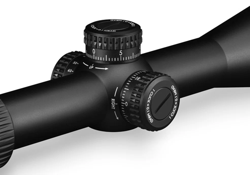 На прицеле установлен тактические барабаны ввода правок с функцией обнуления, блокировки и сроса настроек. Шаг выверки 1/10 mrad, запас хода по 25 mrad по двум осям. За один оборот барабан сместит сетку на 6 MRAD.