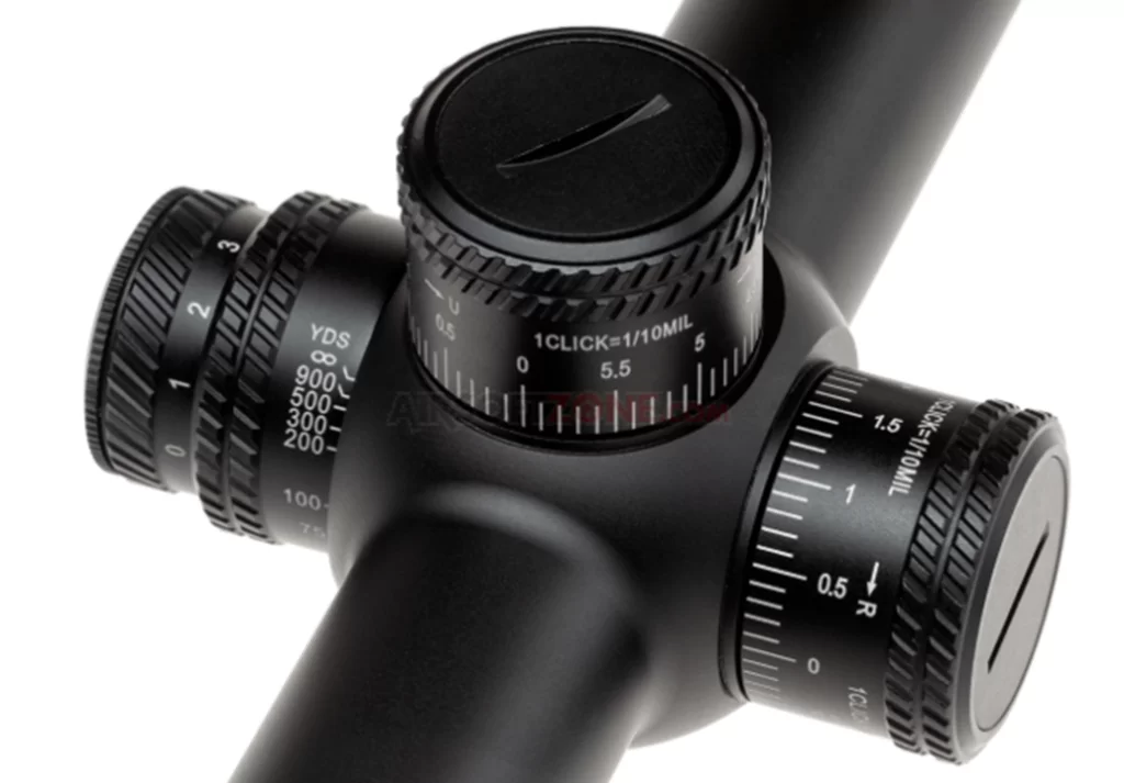 На прицеле установлены револьверные головки тактического типа с разметкой в милах (MIL). Один клик равен 1/10 MIL. Диапазон регулировок на ветер и дальность составляет 17 MIL. Есть функции блокировки, установки нового ноля, предусмотрен также сброс настроек. Параллакс отстраивается при помощи бокового барабана. Минимальная дистанция 20 ярдов.