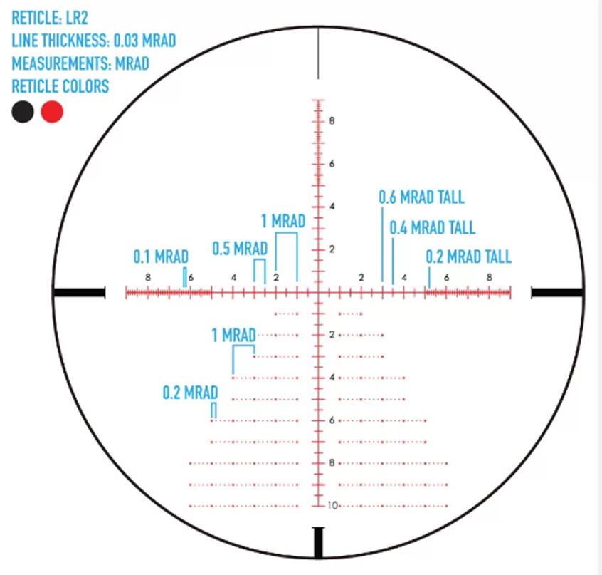 Сетка LR2 является практическим аналогом распространенного снайперского варианта «Хорус», расположена в первой фокальной плоскости объектива (FFP). Такое расположение обладает рядом преимуществ, так как сетка сохраняет угловые размеры между элементами при любом увеличении. Разметка в милирадианах (mrad) является более привычной для многих профессионалов. Стрелок может вести огонь выносом, компенсируя падение траектории полета пули на дистанции, также можно брать упреждение на движение и учитывать влияние ветровой нагрузки без использования барабанов выверки. Кроме того, можно быстро оценить примерное расстояние к объекту при известных габаритных размерах.