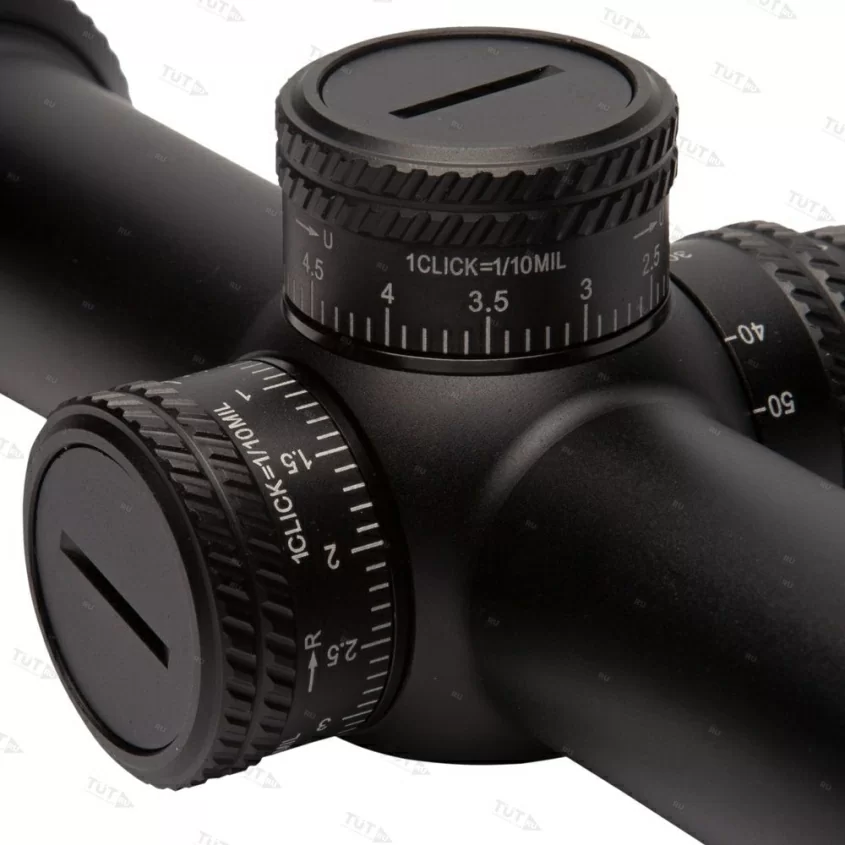 На прицеле установлены револьверные головки тактического типа с разметкой в милах (MIL). Один клик равен 1/10 MIL. Диапазон регулировок на ветер и дальность составляет 17 MIL. Есть функции блокировки, установки нового ноля, предусмотрен также сброс настроек. Параллакс отстраивается при помощи бокового барабана. Минимальная дистанция 20 ярдов.