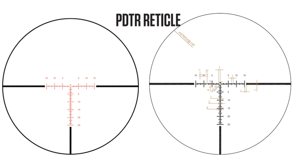 Сетка PDTR – один из лучших охотничьих вариантов для работы на средних дистанциях. Расширенная градуировка вертикальной и горизонтальных направляющих поможет вести стрельбу выносом, компенсируя падение траектории полета пули. Стрелок также может брать упреждение на движение цели и учитывать влияние ветра при дальних выстрелах. Разметка в угловых минутах (МОА) хорошо знакома многим любителям и профессионалам. Сетка выгравирована на стекле и расположена во второй фокальной плоскости (Second Focal Plane). Параллакс можно отстроить при помощи бокового барабана.