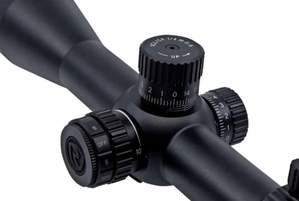 Прицел оснащен тактическими турелями открытого типа с возможностью быстрого сброса настроек. Цена клика ¼ МОА, доступны регулировки по высоте и горизонту, диапазон ввода правок - 85 угловых минут (МОА).