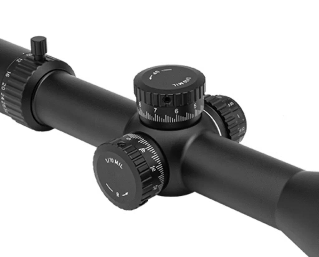 Внести поправки можно при помощи открытых турелей тактического типа с функциями сброса настроек и установки нового ноля. Шаг выверки 1/10 MRAD, запас хода на дальность и силу ветра - 31 MRAD.