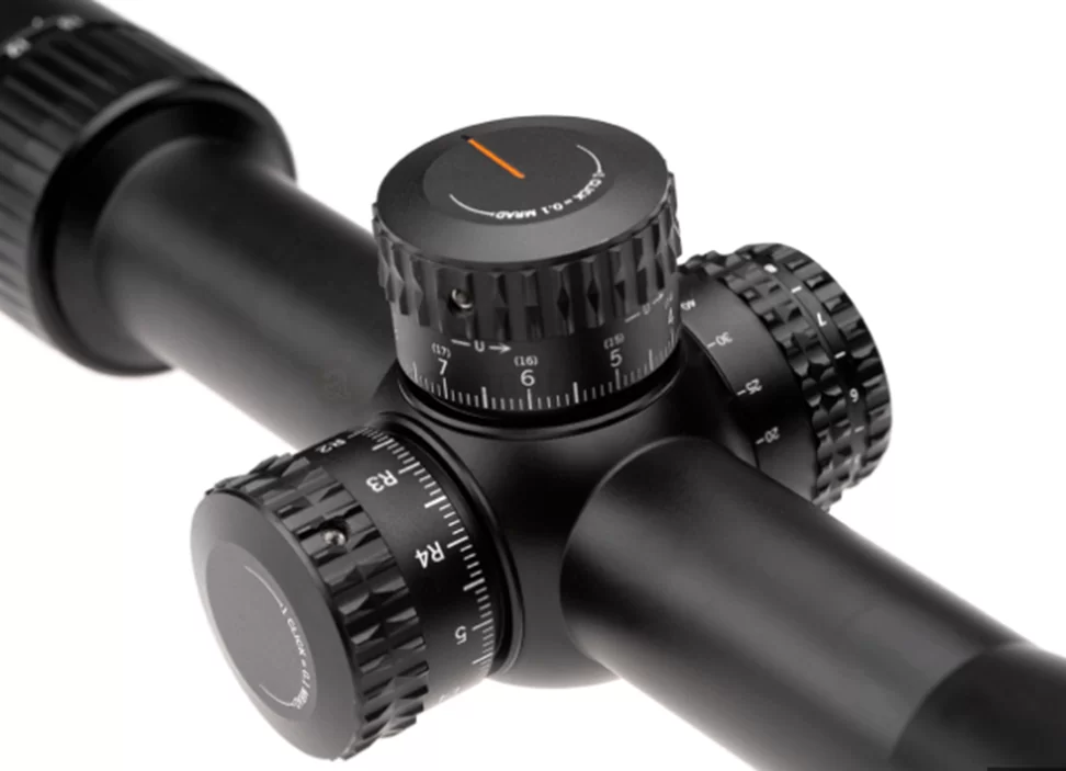 Прицел оснащен высокоточными механизмами ввода правок с тактическими револьверными головками. Элементы системы Rev Stop Zero благодаря механическому нулевому упору позволяют быстро вернуть настройки. Для визуального контроля положения имеется волоконная вставка Radius Bar. Цена клика 1/10 mrad, запас хода по вертикали 22 mrad, по горизонту 11 mrad. За один оборот барабана точка попадания смещается на 10 mrad.