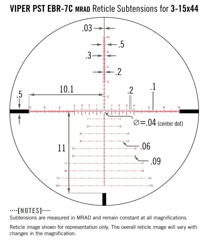 EBR-7C – это снайперская прицельная сетка для точной стрельбы на дальних дистанциях. Расположение в первой фокальной плоскости обладает рядом очевидных преимуществ. При повышении кратности сетка пропорционально увеличивается в размерах, сохраняя угловые размеры между элементами постоянными. Это позволяет контролировать точку попадания ведя стрельбу выносом. Также можно учитывать падение пули на дистанции, учитывать ветровой снос или брать упреждение на движение без внесения правок в положение сетки.