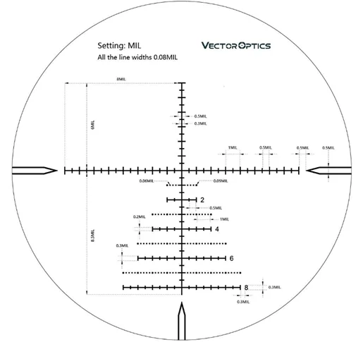 VPA-MF является практически точным аналогом известной снайперской сетки «Хорус». Размещенная в первой фокальной плоскости (FFP), она позволяет стрелку брать поправки на дистанцию и ветер без необходимости использования выверочных механизмов, даже при изменении увеличения. Угловые размеры элементов сетки остаются одинаковыми на всех уровнях кратности. Метод лазерной гравировки на стекле гарантирует ее устойчивость и долговечность даже при активном использовании. Разметка выполнена в Милах.