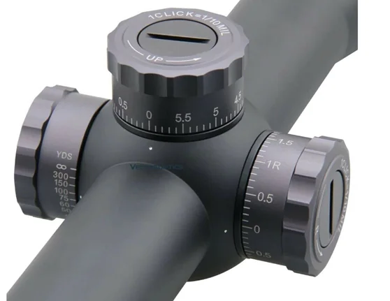 Барабаны для коррекции положения прицельной сетки имеют цену клика 1/10 MIl и позволяют вносить изменения до 17,5 MIL как по вертикали, так и по горизонтали. Крупная маркировка помогает легко определить положение барабана. Ощутимые щелчки при вращении улучшают удобство использования, даже если стрелок в перчатках. Револьверная головка оснащена опциями для сброса текущих настроек, блокировки и установки нового нуля.