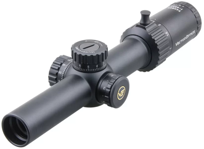 Прицел Vector Optics Taurus 1-6x24 FFP оснащен тактическими барабанами ввода поправок открытого типа. Имеется функция сброса настроек и установки нового нуля. Цена клика равна 1/5 MIL, доступный диапазон ввода поправок по вертикальной и горизонтальной оси составляет по 60 MIL.