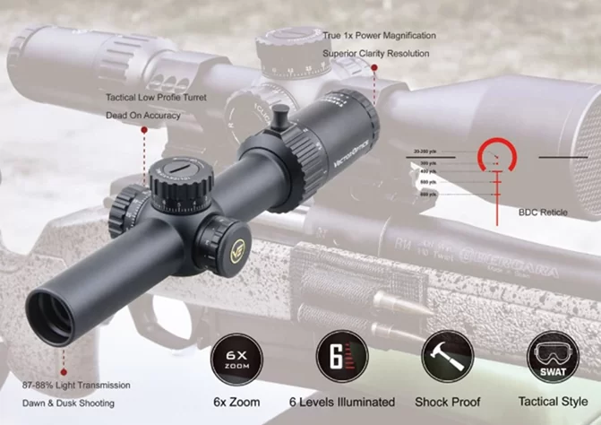 Vector Optics Taurus 1-6x24 FFP – тактический загонник с прицельной сеткой в первой фокальной плоскости. Оптическая система построена на низкодисперсных немецких стеклах, обеспечивающих прекрасную видимость цели даже при крайне слабом освещении. Быстро фокусируемый окулярный узел позволяет стрелку моментально реагировать на меняющуюся обстановку. Тактическая прицельная сетка с многоуровневой подсветкой центральных элементов и BDC-метками дает возможность вести огонь выносом уже не только на коротких, но и на средних дистанциях. В помощь стрелкам имеются тактические барабаны ввода поправок. Основная сфера применения – тактические виды стрельб в условии ограниченного пространства CQB (Close Quarters Battle). Данная модель относится к категории LPVO оптики, позволяя на минимальном увеличении вести огонь с двумя открытыми глазами, как с обычным коллиматором. Прицел изготовлен в полностью водонепроницаемом алюминиевом корпусе и продут осушенным азотом. Использовать Taurus 1-6x24 FFP можно на любом гражданском вооружении, включая калибр .338LM.