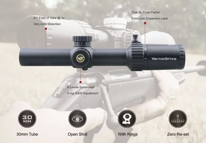 Диапазон увеличения – 1-6х, световой диаметр объектива 24 мм