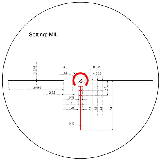 VTC-CMIL – тактическая прицельная сетка, которая расположена в первой фокальной плоскости (FFP). Постоянство угловых размеров между элементами сетки при любом увеличении позволяет уверенно поражать цели, ведя огонь выносом на упреждение при движении цели, или беря поправку на дальность. Многоуровневая подсветка центральных элементов дает возможность идеально настроить видимость сетки при работе разных условиях освещения. Отстройка от параллакса на этой модели выполнена на заводе на дистанцию 100 ярдов (91,4 м). Сетка нанесена на стекла методом лазерной гравировки, имеет разметку в миллирадианах (MIL).