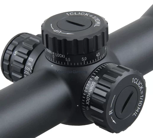 Тактические барабаны имеют шаг выверки 1/10 MIL и позволяют вносить корректировки до 17,5 MIL вдоль вертикальной и горизонтальной оси. Ясно видимая маркировка упрощает определение положения револьверной головки. Ощутимые щелчки при вращении улучшают удобство использования, даже в перчатках. Кроме того, прицел оборудован функциями сброса текущих настроек, блокировки и установления новой начальной точки. В комплекте поставки есть две дополнительные головки с разметкой в MRAD и См.