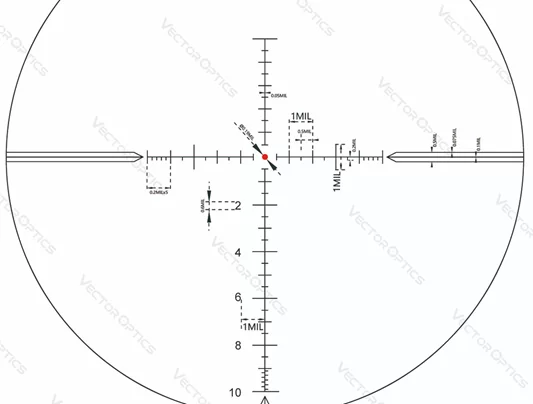 MPX1 – тактическая прицельная сетка, которая выгравирована на стекле и располагается в первой фокальной плоскости FFP. Сохраняя все угловые размеры между элементами постоянными независимо от увеличения прицела, она имеет ряд преимуществ. Стрелок может эффективно осуществлять стрельбу выносом без использования механизмов ввода поправок. Центральная точка имеет многоуровневую подсветку. Разметка сетки в MIL.