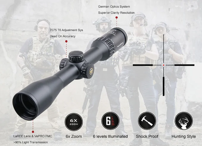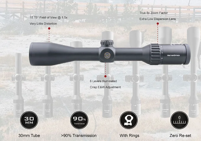 Оптическая система прицела Vector Optics Continental Hunting 1,5-9x42 SFP основана на использовании немецкого низкодисперсного стекла, что полностью исключает хроматические аберрации и эффект комы. Прицел предоставляет четкое и контрастное изображение цели, даже при низком уровне освещения на максимальном увеличении. Быстрофокусируемый окуляр позволяет оперативно наводить резкость на удаленные объекты. Диапазон оптического увеличения составляет от 1,5 до 9х. Особенностью модели является широкий угол обзора, который на минимальном увеличении позволяет охватывать пространство шириной 28 метров на расстоянии 100 м. Комфортный вынос выходного зрачка в 100 мм делает его подходящим для стрельбы из оружия крупных гражданских калибров.