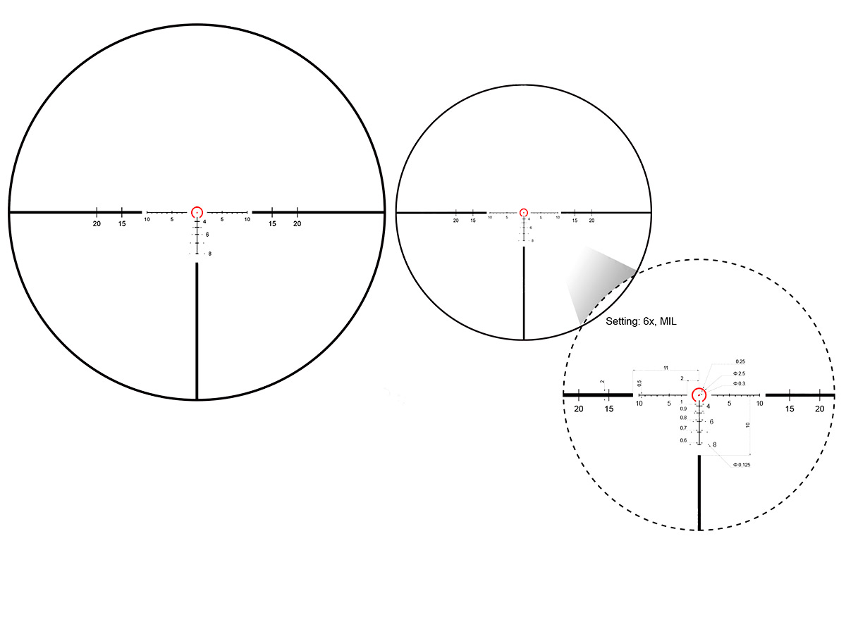 Vector Optics Continental Tactical 1-6x24 SFP оснащен тактической прицельной сеткой VEC-T6M, которая расположена во второй фокальной плоскости SFP. Ряд BDC-меток на вертикальной направляющей в нижнем секторе позволяет контролировать положение точки попадания на дистанции до 600 ярдов. Горизонтальная разметка поможет брать упреждение при работе по подвижным целям. Центральную точку окружает светящийся круг, позволяющий быстро захватывать и наводиться на цель. Интенсивность подсветки регулируется боковым барабаном в пределах 6 уровней. Параллакс отстроен на заводе изготовителе на расстояние 100 ярдов.