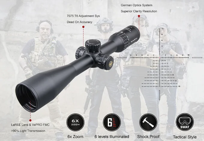 Оптическое увеличение в диапазоне от 4 до 24х позволяет с легкостью фокусироваться на удаленных объектах. Регулировка параллакса осуществляется при помощи бокового барабана. Вынос выходного зрачка на 100 мм дает возможность вести огонь в тактических очках. Линейное поле зрения на минимальной кратности 10,4 м/100м упрощает обнаружение целей и точное наведение. Этот прицел оснащен высококлассной немецкой оптической системой, которая включает в себя линзы LaREE и многослойное просветляющее покрытие VePRO FMC. С его светопроводимостью в 90%, он является идеальным для условий с низкой освещенностью. Использование низкодисперсных стёкол снижает хроматические аберрации, обеспечивая четкое и контрастное изображение объектов во всем поле зрения.