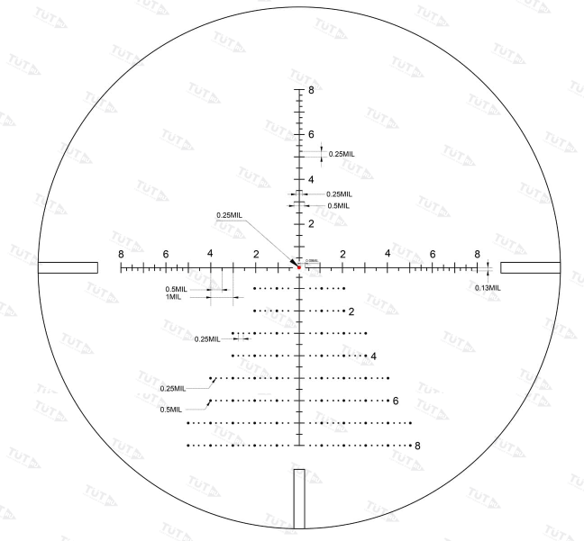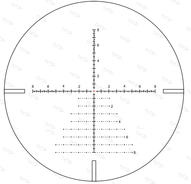 VCT-20 по своей конфигурации практически полностью соответствует известной снайперской сетке Хорус. Она выгравирована на стекле и расположена во второй фокальной плоскости, разметка приведена в миллирадианах. Ее истинные угловые размеры соответствуют 20-кратному увеличению. Расширенная горизонтальная разметка идеально подходит для стрельбы выносом, брать поправки на дальность и силу ветра можно без применения выверочных механизмов. Подсветка центральной точки имеет 6-ти уровневую регулировку яркости, обеспечивая высокий контраст на мишени в любых условиях освещенности.