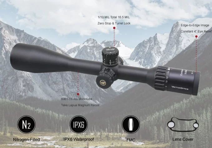 Оптический прицел Vector Optics Continental Tactical 5-30x56, относящийся к премиальному сегменту продукции Vector Optics, идеально подходит для стрельбы на дальние расстояния, включая горную охоту и другие виды высокоточной стрельбы. Эта модель сочетает функциональность тяжелых спортивных прицелов с более широкими трубками. Высококачественная оптика на основе немецких линз LaREE и VePRO FMC гарантирует светопропускание до 90 %. Снайперская сетка VCT-20 с точной механикой для коррекции позволяет достичь максимальной точности при стрельбе на дистанциях до и более одного километра. Быстрая фокусировка ускоряет подготовку к выстрелу. Монолитный алюминиевый корпус прицела Vector Optics Continental Tactical 5-30x56 обеспечивает водонепроницаемость и надежность в любых погодных условиях, даже при использовании с крупными снайперскими калибрами.