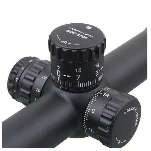 Этот прицел оборудован открытыми барабанами для корректировки, с четкой и легко различимой шкалой. Каждое деление равно 0,1 MIL. Пользователям доступен широкий спектр настроек для вертикальных и горизонтальных корректировок (до 16,5 MIL). Конструкция механизмов ввода поправок выполнена из высокопрочного алюминия 7075 T6, поддерживаются опции блокировки, быстрого сброса и установки нового нуля.