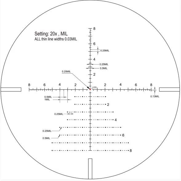 Снайперская прицельная сетка VCT-20 по своим очертаниям является практически полным аналогом знаменитого Хорус. Сетка выгравирована на стекле, находится во второй фокальной плоскости и имеет разметку в MIL. Истинные угловые размеры соответствуют увеличению 20х. Расширенная горизонтальная разметка позволяет осуществлять стрельбу выносом, беря поправки без использования механизмов выверки. Многоуровневая подсветка центральной точки позволяет настроить идеальную видимость на мишени, независимо от внешнего уровня освещенности.