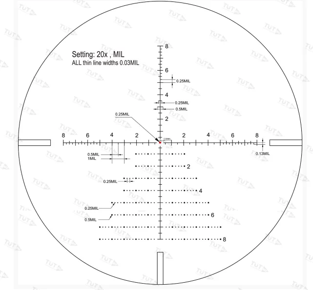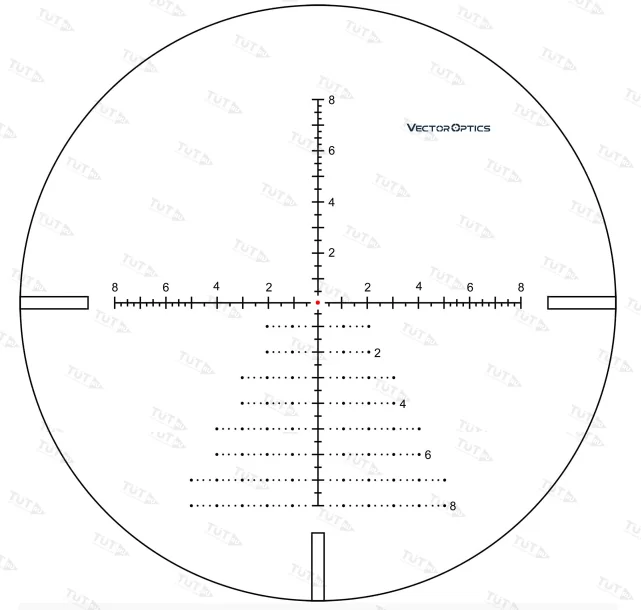 Снайперская прицельная сетка VCT-20 по своим очертаниям является практически полным аналогом знаменитого Хорус. Сетка выгравирована на стекле, находится во второй фокальной плоскости и имеет разметку в MIL. Истинные угловые размеры соответствуют увеличению 20х. Расширенная горизонтальная разметка позволяет осуществлять стрельбу выносом, беря поправки без использования механизмов выверки. Многоуровневая подсветка центральной точки позволяет настроить идеальную видимость на мишени, независимо от внешнего уровня освещенности.
