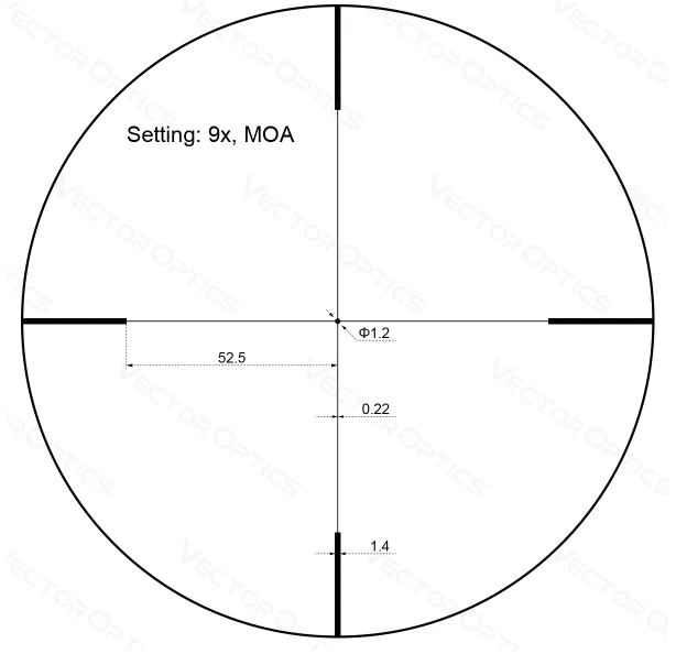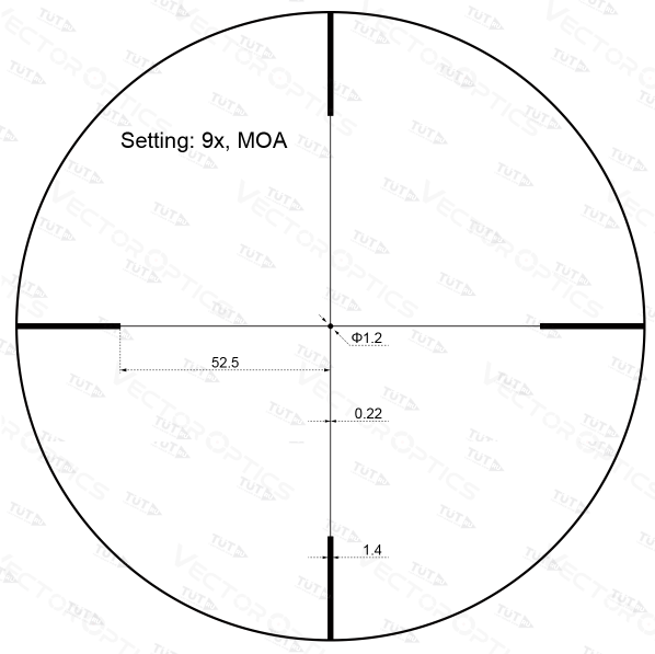 VFD-3 - классическая охотничья прицельная сетка, которая размещена во второй фокальной плоскости (SFP) и нанесена непосредственно на линзы методом лазерной гравировки. Ее разметка выполнена в МОА, а угловые размеры элементов приведены для использования при максимальном увеличении в 9х. Тонкие линии перекрестья способствует увеличению точности при стрельбе по мелким целям. Эта конфигурация идеально подходит для стрельбы не только на коротких, но и на средних расстояниях.