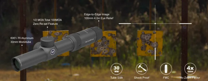 Оптические элементы прицела покрыты высококачественным многослойным покрытием FMC (Full Multi Coated), обеспечивающим четкость изображения в условиях слабой освещенности. Устройство для смены кратности оснащено специальным упором, что способствует быстрому переключению масштаба. Прицел также имеет заранее установленную фабричную отстройку параллакса на дистанцию 50 ярдов. При установке увеличения на 3х, поле обзора равно 12 метрам на расстоянии 100 метров. С выносом выходного зрачка в 75 мм прицел идеально подходит для использования на огнестрельном оружии большого калибра.