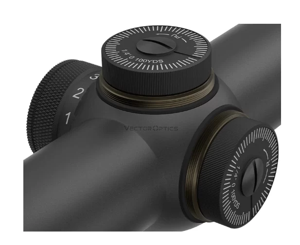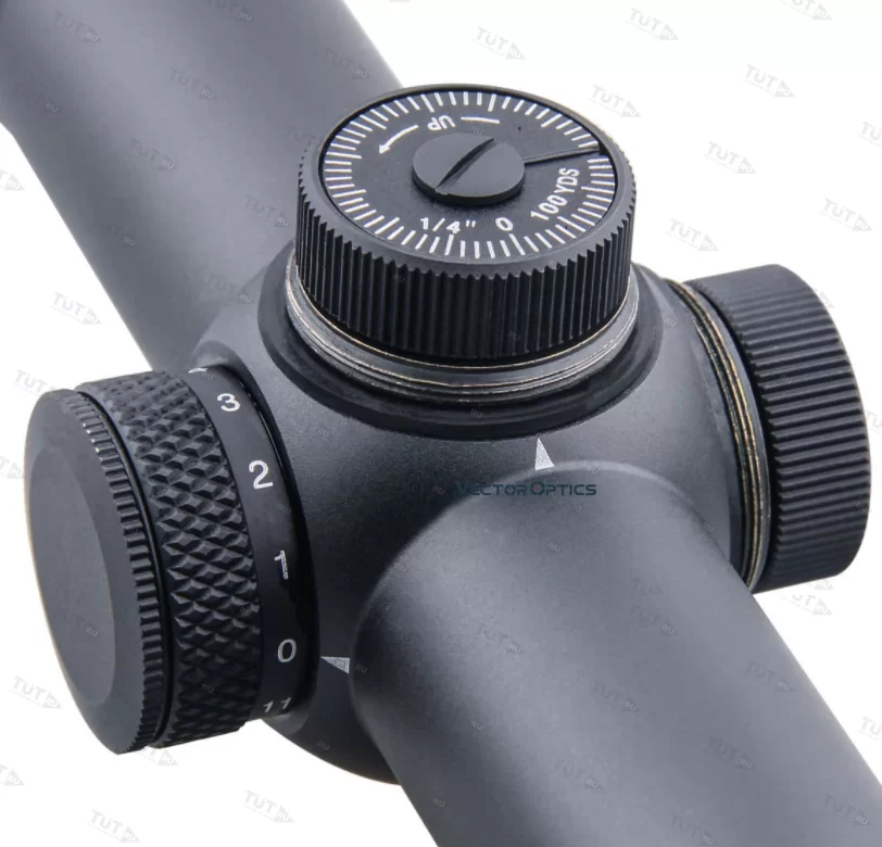 В данном прицеле используются закрытые барабаны для введения корректировок. Цена клика равна ¼ угловой минуты (МОА). Вносить поправки можно в диапазоне до 60 МОА по обеим осям — вертикальной и горизонтальной.