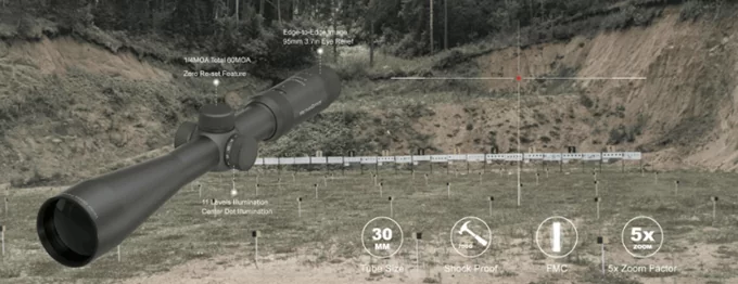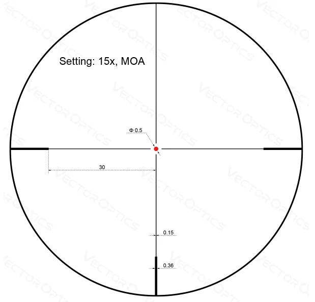 В данном прицеле используется традиционная охотничья сетка VFD-2, которая расположена во второй фокальной плоскости (SFP). Центральная точка имеет многоуровневую подсветку, позволяющую адаптировать ее видимость на мишени, независимо от внешней освещенности. Дизайн с тонкими линиями перекрестия облегчает точное прицеливание по малым объектам. Эта модель прицела предназначена для стрельбы на близких и средних дистанциях, будь то статичные или движущиеся цели. Разметка приведена в угловых минутах (МОА), истинные размеры соответствуют максимальному увеличению – 15х.