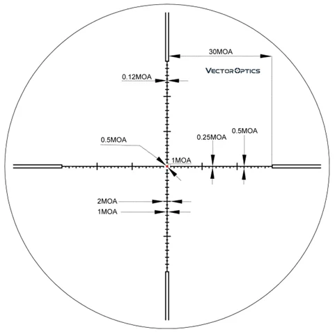 Тактическая прицельная сетка VHL-2 по своей конфигурации напоминает классический Мил-Дот, позволяющий вести стрельбу выносом точки прицеливания и оценивать расстояние по известным габаритам цели. Сетка выгравирована на стекле и располагается во второй фокальной плоскости SFP. Многоуровневая подсветка центральной точки позволяет тонко настраивать видимость на теле мишени при разном уровне освещенности. Угловые размеры между элементами приведены в МОА и соответствуют максимальному увеличению 18х.