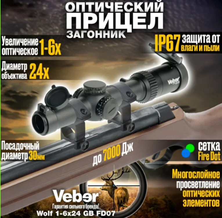 Оптический прицел Veber Wolf 1-6х24 GB FD07 имеет следующие характеристики: