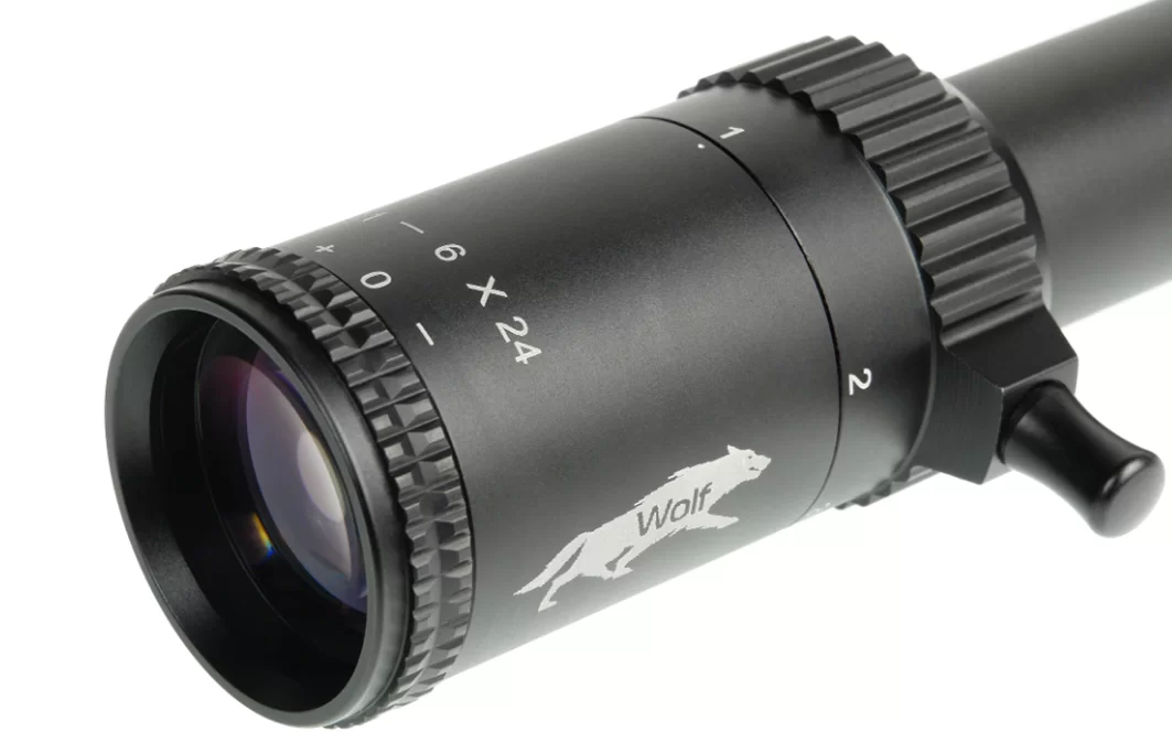 Прицел Veber Wolf 1-6х24 GB FD07 имеет диаметр объектива 24 мм и сменный диапазон кратности от 1х до 6х. На оптические поверхности стекло/воздух нанесено многослойное просветляющее покрытие FMC с антибликовым эффектом. Узел смены кратности оснащен специальным упором для пальца, позволяющим манипулировать настройками оптики без необходимости обхватывать окуляр рукой. Окулярная точка вынесена на комфортное для работы крупным калибром расстояние (88 -110 мм). Угол пространственного поля зрения FOV (Field of view) на минимальной кратности имеет значение 18,3° - 13,1°, в линейном выражении это соответствует области пространства размером 32,2 - 23 метров на удалении в 100 м. Параллакс отстроен на заводе изготовителе на отметку 100 ярдов (91м).