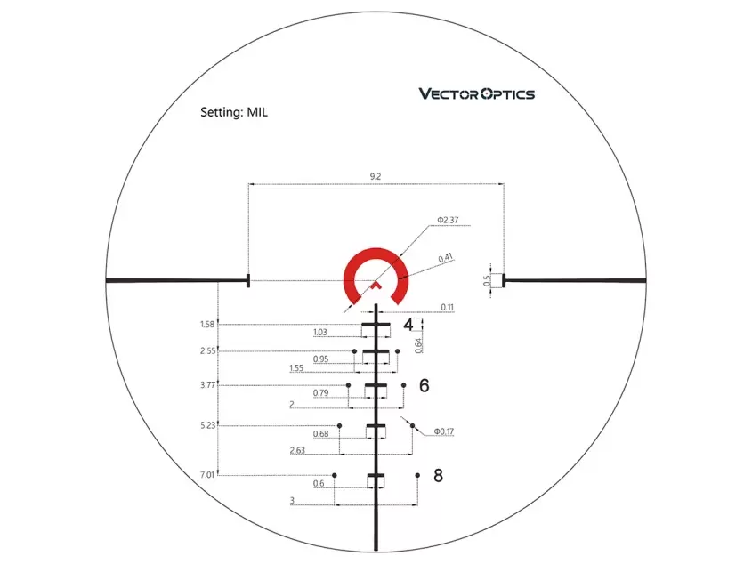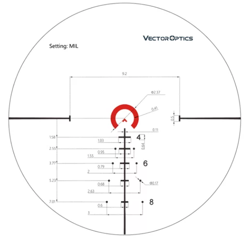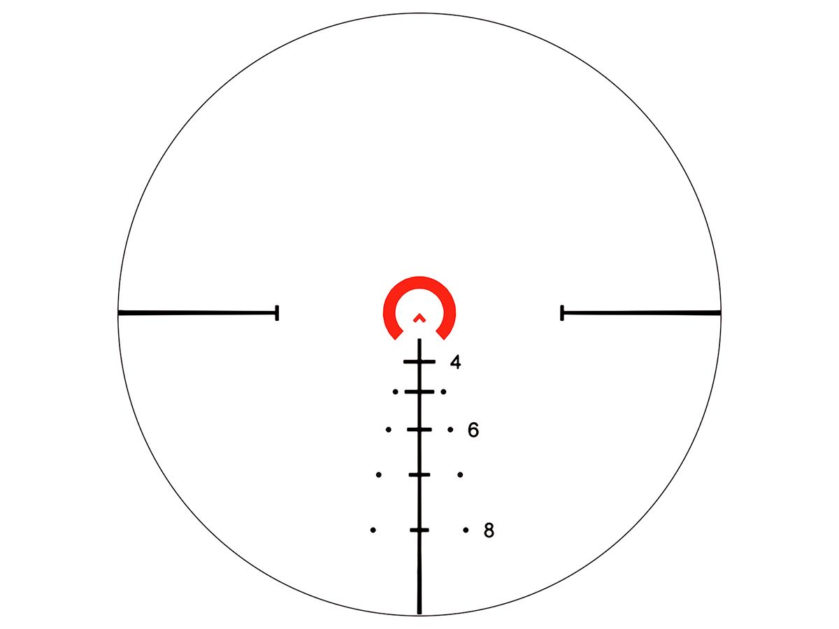 Прицел оснащен тактической FFP сеткой VCT-BNW, что обеспечивает контроль за точкой попадания на дистанциях до 600 ярдов благодаря вертикальным BDC меткам. Горизонтальные отметки упрощают стрельбу по движущимся целям, обеспечивая точное упреждение. Центр сетки окружен освещенным кругом для более быстрого и точного наведения на цель. Интенсивность подсветки можно регулировать на шести уровнях с помощью бокового колеса. Настройка параллакса произведена на заводе на дистанцию в 100 ярдов.