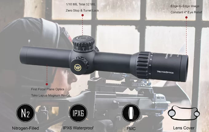 Vector Optics Continental x6 1-6x28 FFP 34mm является премиальным тактическим прицелом, принадлежащим к категории LPVO. Это делает его идеальным для использования в качестве обычного коллиматора, на минимальной кратности можно вести огонь с двумя открытыми глазами. Прицел разработан для тактической стрельбы на близких и средних дистанциях (CQB), также подходит для загонной охоты. Прицельная FFP сетка VCT-BNW с метками BDC позволяет точно определять место попадания пули на дистанции до 600 ярдов. Кристально чистая немецкая оптика с низкой дисперсией гарантируют отличную видимость целей даже при слабом освещении. Подсветка центральных элементов сетки и быстрая фокусировка окуляра помогают оперативно реагировать на смену обстановки. Крепкий алюминиевый корпус прицела устойчив к запотеванию и экстремальным условиям эксплуатации.