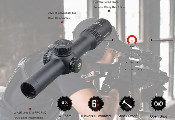 Оптическая схема построена на качественных немецких стеклах с линзами LaREE и комплексным многослойным просветляющим покрытием VePRO FMC, благодаря чему светопроводимость достигает 90%. Это обеспечивает отличную видимость даже в условиях недостаточной освещенности. Поле зрения на минимальной кратности 1х в 23,5° на 100 метров дает возможность охватывать пространство шириной до 41,6 метров, упрощая процесс обнаружения целей. При максимальной кратности в 6х прицел идеален для стрельбы на дистанции свыше 300 метров. Вынос выходного зрачка в 100 мм гарантирует комфортное использование прицела даже в очках.