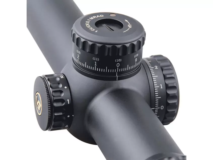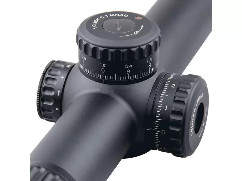 Данный прицел оснащен открытыми барабанами ввода корректировок. Цена клика составляет 0,1 MIL. Стрелкам доступен диапазон ввода вертикальных и горизонтальных поправок в пределах 52/20 MIL. Механика ввода корректировок изготовлена из сверхпрочного алюминия марки 7075 T6. За один оборот барабан делает 100 щелчков. Есть функция блокировки и установки нового нуля.