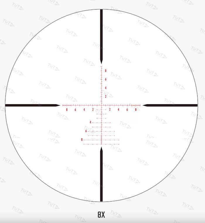 Внести изменение в положение сетки можно при помощи запираемых турелей тактического типа. Есть опция обнуления и сброса настроек. Шаг выверки 1/10 Mil, запас хода на дальность и силу ветра - 13 Mil, за один оборот сетка сместиться на 6 Mil.