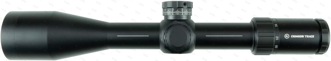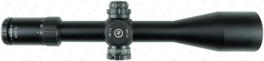 Crimson Trace Optics 5-25x56mm оснащен револьверными головками тактического типа. Разметка в милах (MIL). Есть функция сброса настроек и установки нового ноля. Шаг выверки 1/10 MIL. Запас хода по вертикали 80, по горизонту 70 MIL. Отстройка от параллакса осуществляется боковым барабаном от 10 ярдов до бесконечности.