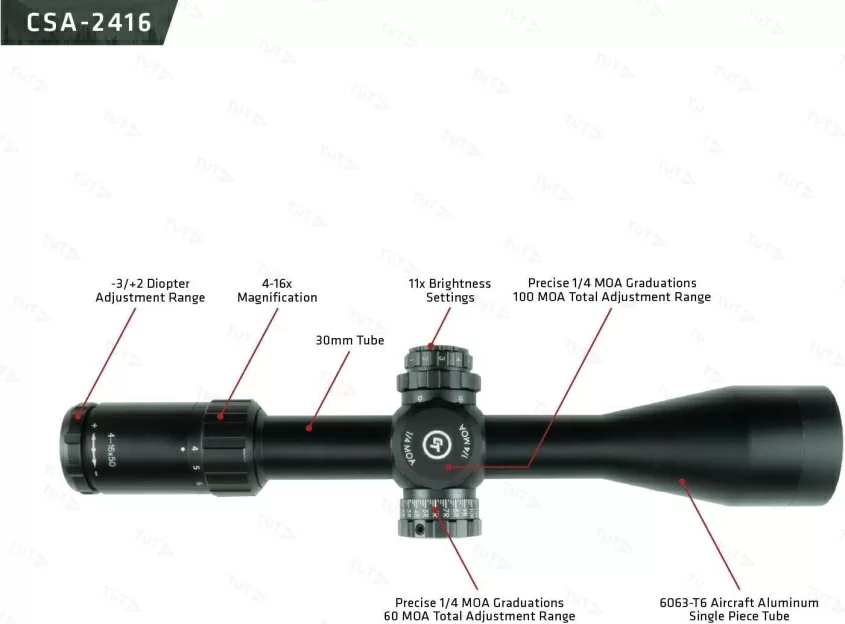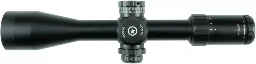 Светосильный объектив с диаметром апертуры 50 мм пропускает достаточно света для эффективного применения при слабом, сумеречном освещении. Стрелкам доступен диапазон кратности от 4 до 16х и широкий угол поля зрения. Фирменное просветляющее покрытие и качественные японские ED стекла увеличили коэффициент светопропускания до 90%. Механика смены кратности с плавным ходом позволяет манипулировать настройками при помощи одного пальца. Вынос выходного зрачка на расстояние более 80 мм дополнительно обеспечивает безопасность на крупном калибре. Доступна диоптрийная корректировка для настройки под индивидуальные особенности зрения.