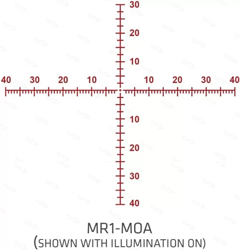 Сетка MR1 – тактический вариант с расширенной вертикальной и горизонтальной градуировкой. Разметка в угловых минутах (MOA) привычна многим спортсменам и охотникам. Визир расположен в первой фокальной плоскости First Focal Plane (FFP), все угловые размеры между отдельными элементами сохраняются неизменными в не зависимости от увеличения. Опытные стрелки могут вести стрельбу выносом точки прицеливания, не используя барабаны ввода правок. Пользователям доступна подсветка сетки, всего 11 уровней яркости. Питание от батареи CR2032 гарантирует до 60-ти часов работы.