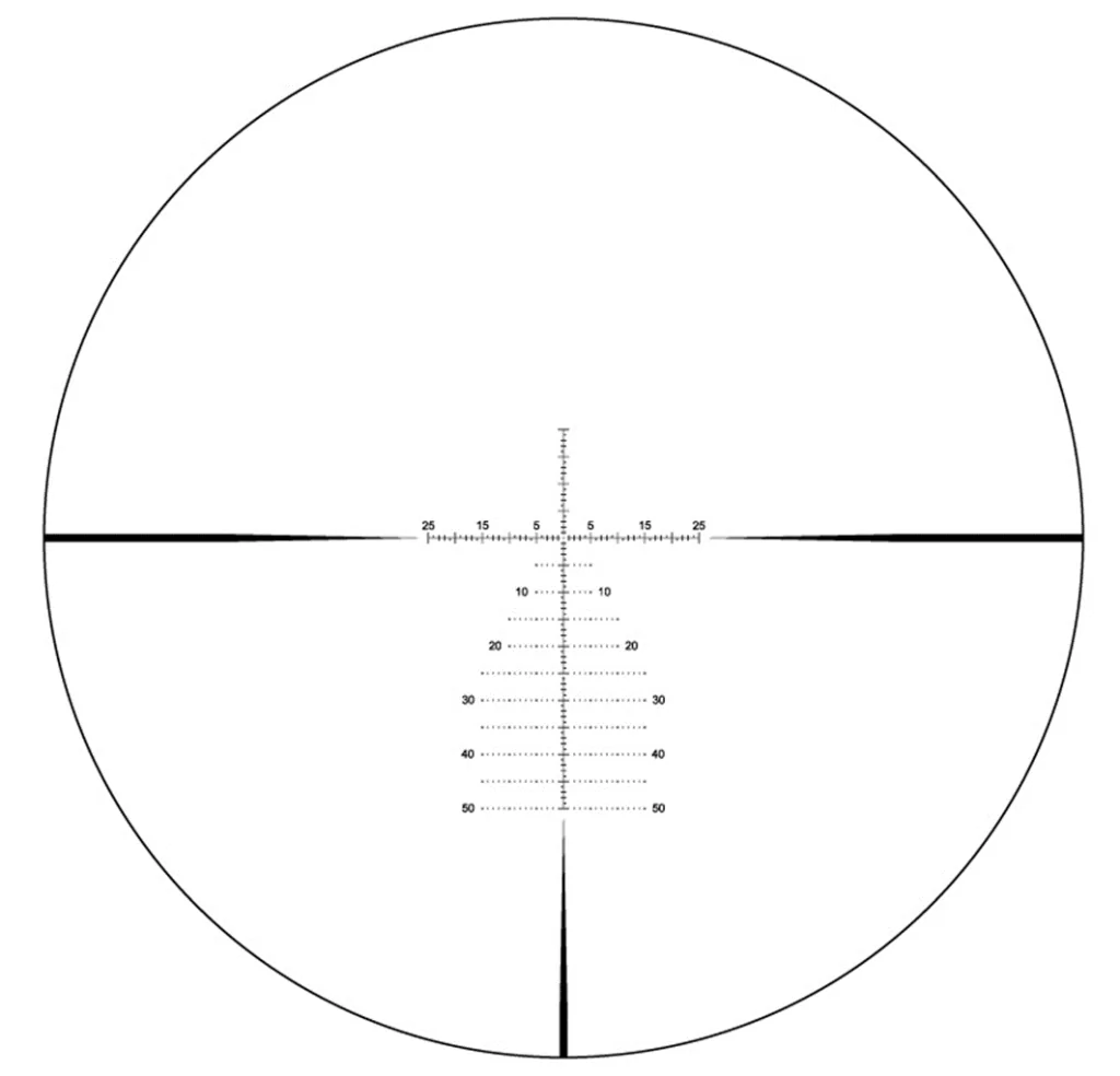 Сетка MPSR MOA расположена в первой фокальной плоскости. По своей конфигурации напоминает распространенный снайперский вариант – «Хорус». Все угловые размеры между элементами остаются постоянными при любом увеличении, так как сетка увеличивается пропорционально кратности. Расширенная разметка в нижней части позволяет вести стрельбу выносом, брать правки на дальность и ветер без использования механизмов выверки. Также можно определить расстояние к объекту по известным размерам, и скорость движения цели. Сетка выгравирована на стекле и не собьется при интенсивных нагрузках. Отстройка от параллакса производится при помощи бокового барабана.