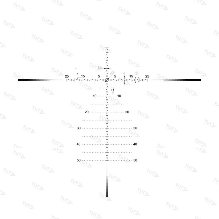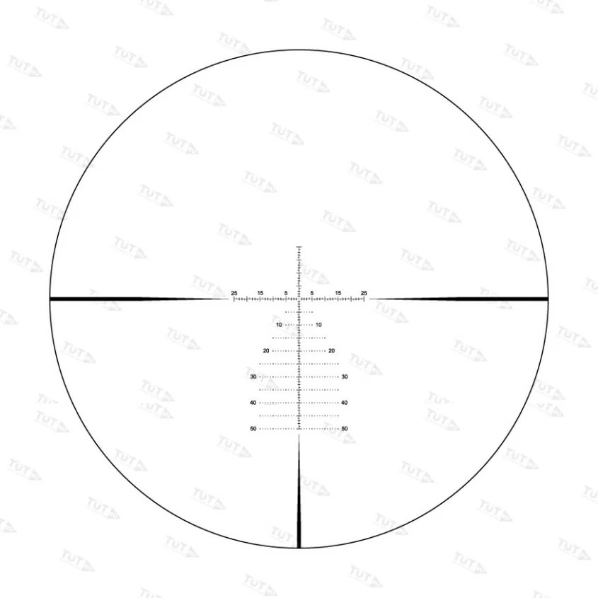 Сетка MPSR MOA расположена в первой фокальной плоскости. По своей конфигурации напоминает распространенный снайперский вариант – «Хорус». Все угловые размеры между элементами остаются постоянными при любом увеличении, так как сетка увеличивается пропорционально кратности. Расширенная разметка в нижней части позволяет вести стрельбу выносом, брать правки на дальность и ветер без использования механизмов выверки. Также можно определить расстояние к объекту по известным размерам, и скорость движения цели. Сетка выгравирована на стекле и не собьется при интенсивных нагрузках. Отстройка от параллакса производится при помощи бокового барабана.