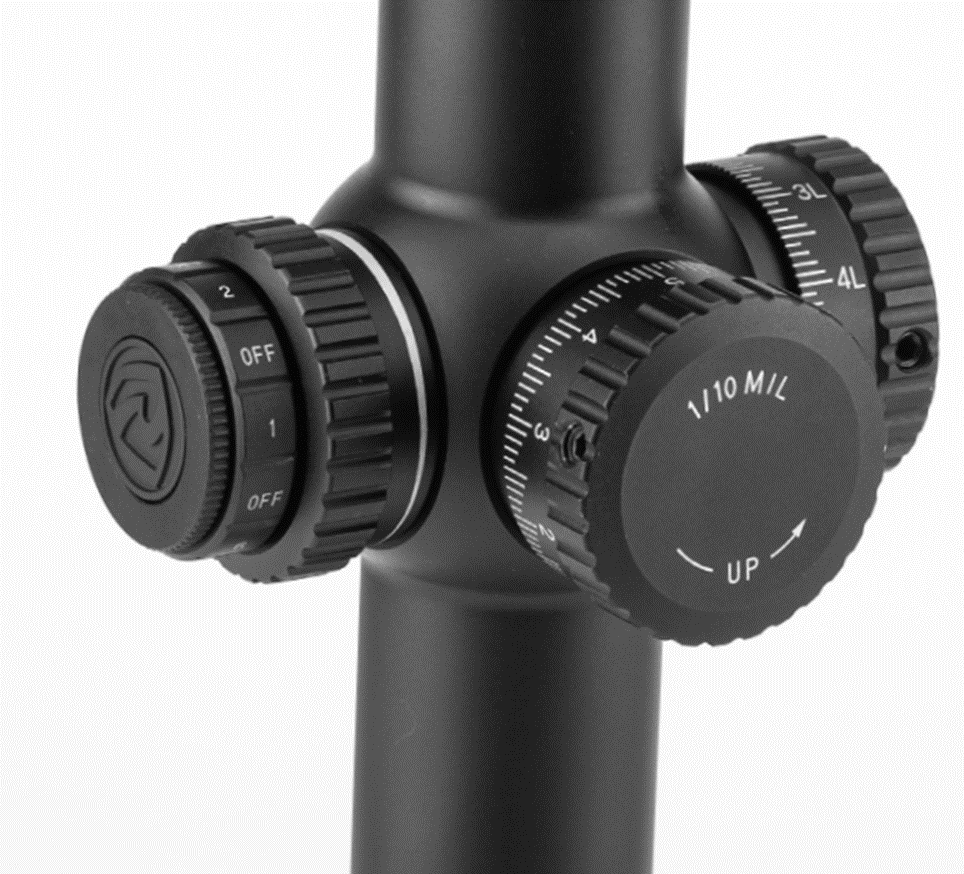 Прицел оснащен высокоточными механизмами выверки. Это массивные турели тактического типа с функцией обнуления и быстрого сброса настроек. Цена клика 1/10 MRAD, доступен диапазон ввода на дальность и ветер по 28 MRAD.