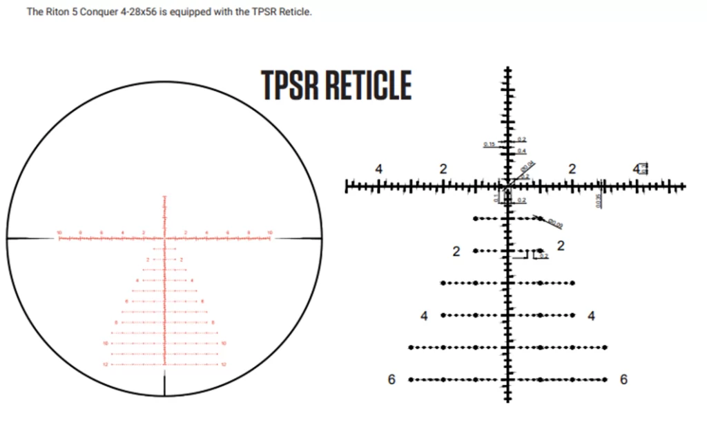 TPSR – снайперская прицельная сетка, напоминающая распространенный вариант - «Хорус». Расположение в первой фокальной плоскости полностью соответствует концепции профессиональной оптики. Угловые размеры между элементами всегда постоянны при любом увеличении Расширенная вертикальная и горизонтальная градуировка позволяет вести огонь выносом. Опытные стрелки могут компенсировать падение пули на дистанции, брать упреждение на движение цели, определять его скорость и учитывать ветровую нагрузку. Сетка имеет многоуровневую подсветку красным цветом. Особенностью является отключение подсветки между каждым уровнем яркости. Блок управления встроен в боковой барабан отстройки от параллакса. В качестве элемента питания используется литиевая батарея CR2032 напряжением 3В.
